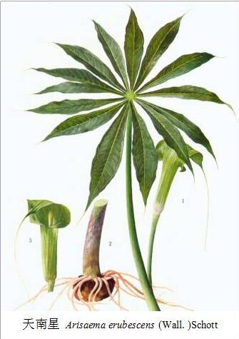 源于天南星科植物天南星Arisaema erubescens(Wall.)Schott.、異葉天南星Arisaema heterophyllum Blume或東北天南星Arisaema amurense Maxim.的干燥塊莖。