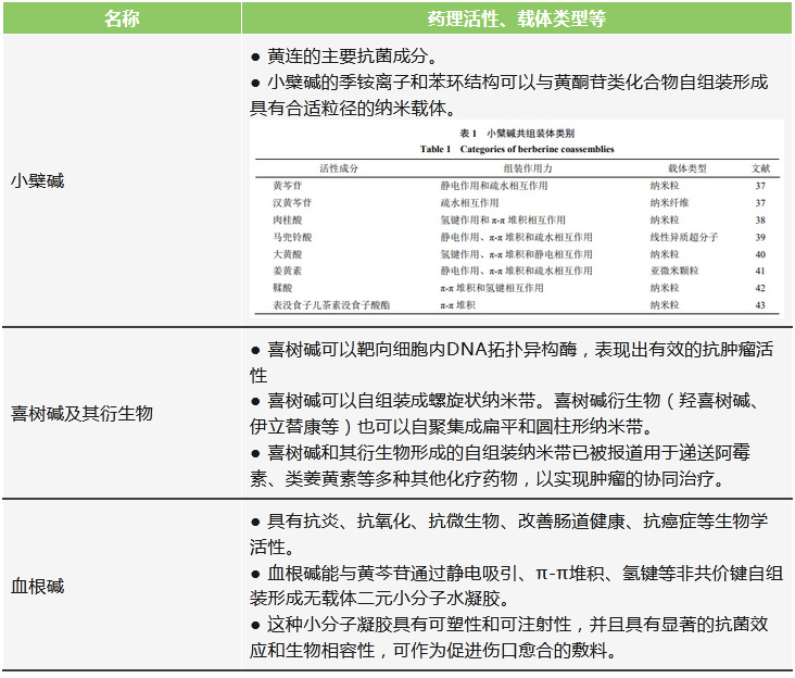 生物堿在許多中藥中廣泛存在,大多數(shù)有復(fù)雜的環(huán)狀結(jié)構(gòu),且含有N元素,呈現(xiàn)堿的性質(zhì)。生物堿是植物在應(yīng)對環(huán)境脅迫時(shí)產(chǎn)生的次生代謝產(chǎn)物,往往具有一定的毒性。在藥理方面,其表現(xiàn)為抗病毒、抗菌的活性。生物堿可以與多種中藥活性成分共組裝,以其自身作為藥物和載體作為藥物和載體,從而發(fā)揮更強(qiáng)的藥效。