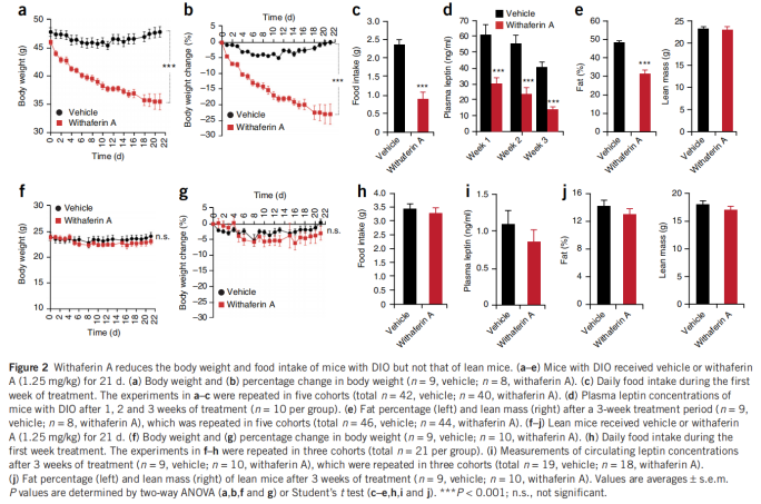醉茄素A通過增強瘦素(leptin)敏感性顯著改善飲食誘導肥胖(DIO)小鼠的代謝異常(圖6)。此外,醉茄素A獨立于瘦素增敏作用,直接改善葡萄糖代謝。為開發(fā)新型抗肥胖藥物提供了新思路,具備臨床轉(zhuǎn)化潛力。[5]